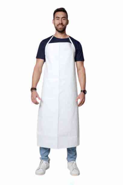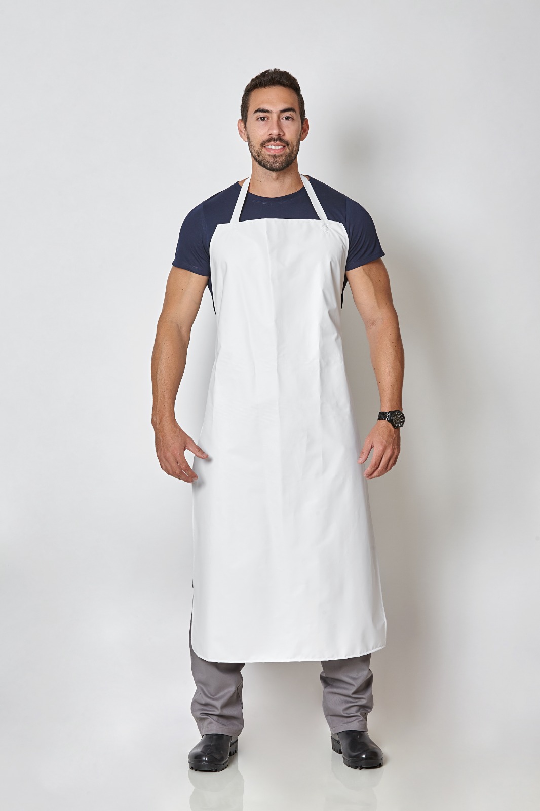 Avental de segurança confeccionado em tecido sintético plastificado com PVC, modelo frontal, ilhoses afixados, tirantes na cintura e nos ombros para ajustes.