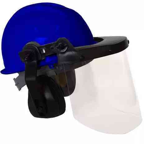 – Carneira fixada ao casco, regulagem por pino, suspensão, protetor facial em um suporte basculante e protetor auditivo tipo concha, constituído por dois abafadores de plástico apresentando almofadas de vedação e espuma no seu interior.