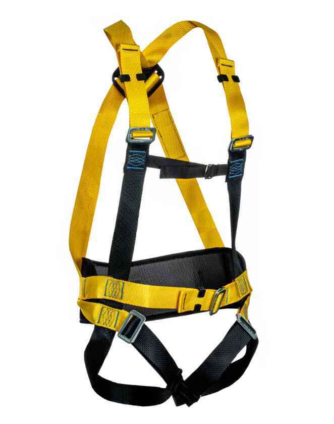 Cinturão de segurança tipo paraquedista integrado com cinturão abdominal, confeccionado em fita de poliéster com um ponto de ancoragem para retenção de quedas na região dorsal “A” e possui dois pontos laterais iguais para posicionamento.