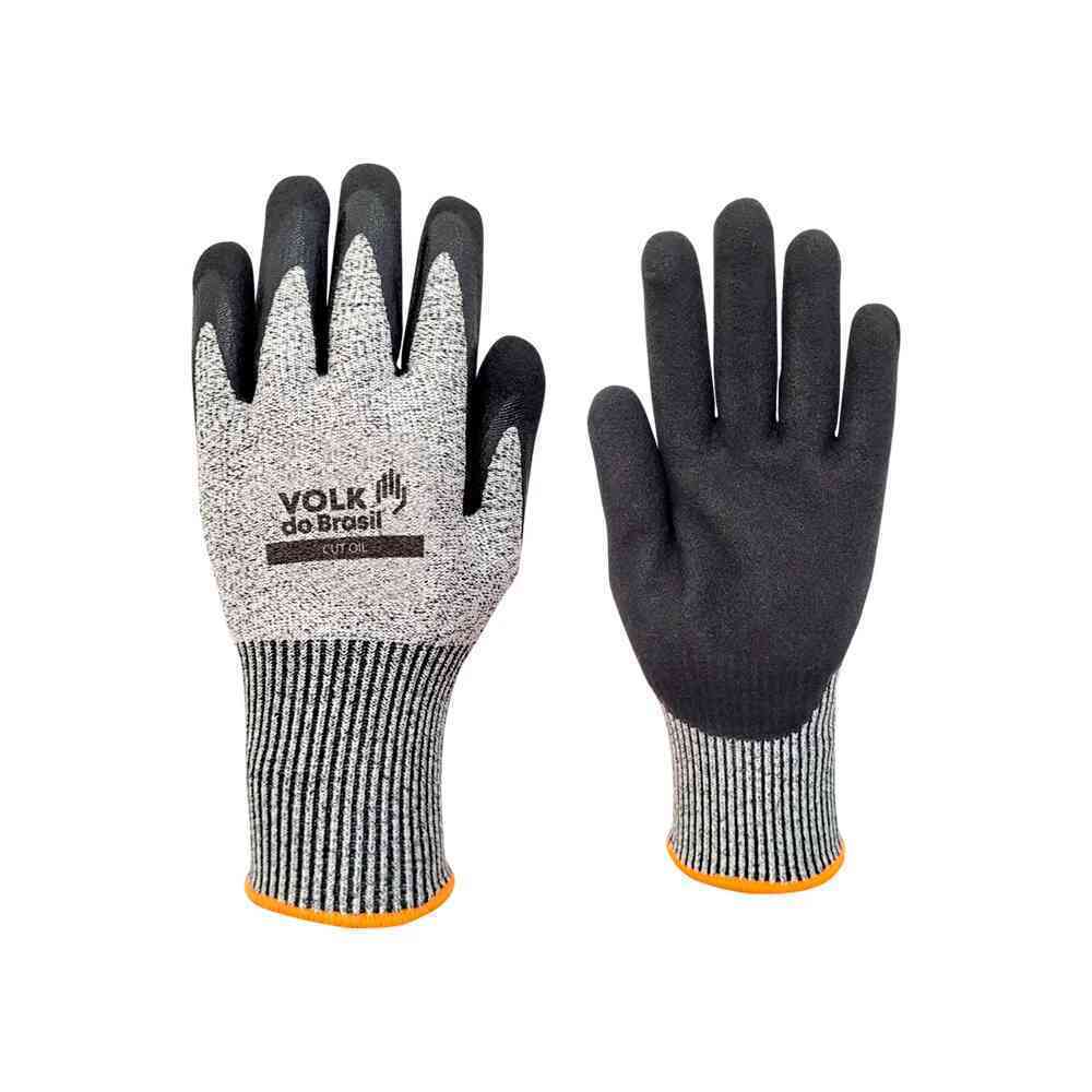 Luva de segurança confeccionada em fibras sintéticas, HPPE (polietileno) 13 gauge, revestida em nitrila tipo sandy (areia) na palma e ponta dos dedos, punho com inserção de fibras elásticas e acabamento em fibras sintéticas.