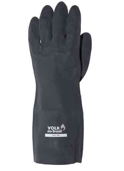 Luva de segurança confeccionada em neoprene e revestimento interno em flocos de algodão, acabamento antiderrapante na face palmar e ponta dos dedos.