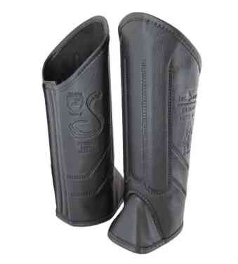 Confeccionada em couro sintético de 4mm de espessura, forrada internamente, em peça única (para sobrepor sobre vestimenta – sem ajuste/regulagem de tamanho), fechamento por velcro, contendo três lâminas de PVC na parte frontal da perneira, de 16 cm de comprimento e 0,6 mm de espessura. Proteção de couro sintético no metatarso. Tamanho único.