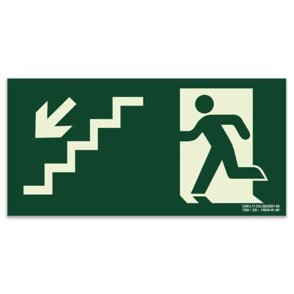 A placa fotoluminescente “Saída Escada Desce a Esquerda”, é Fabricada em PVC fotoluminescente com 2 mm de espessura e superfície antiestática. A placa indica a direção de saída de emergência, sendo ideal para ambientes com ou sem incidência de luz. A placa não contribui para a propagação de chamas quando submetida à ação de fogo, sendo classificada como “Retardador” em conformidade com a Norma IEC 60092-01:2002 exigido pela NBR 13434-3.
