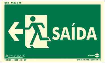 - A Placa Fotoluminescente para indicar a saída de emergência com seta à esquerda, facilmente identificada em locais com ou sem incidência de luz;
