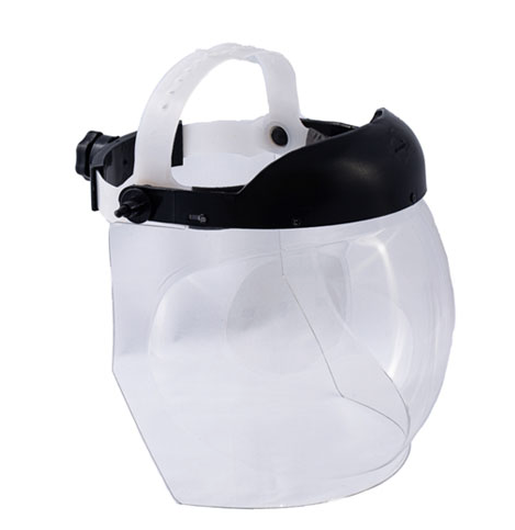 Protetor facial constituído de visor de polietileno tereftalato incolor com formato esférico com cerca de 200mm de largura e 190mm de altura.